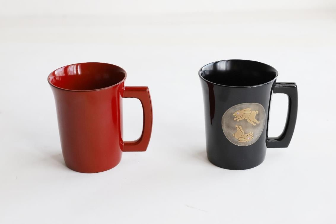 左から、朱/無地、黒/うさぎの蒔絵付。