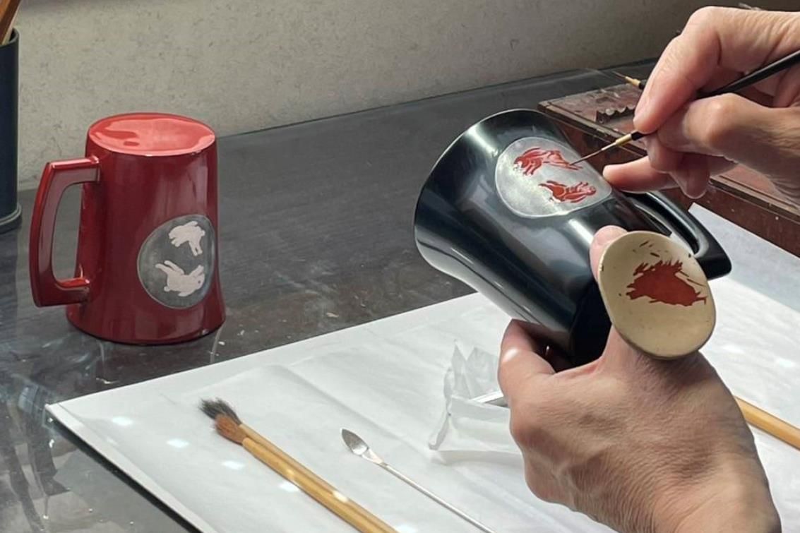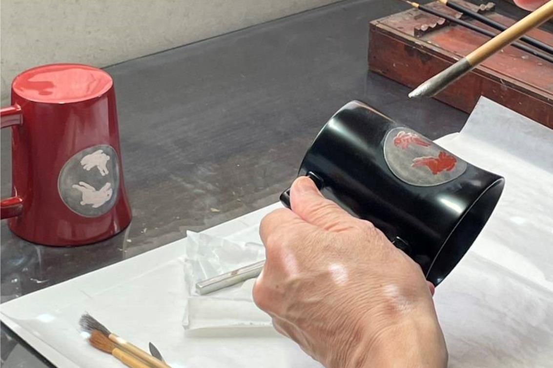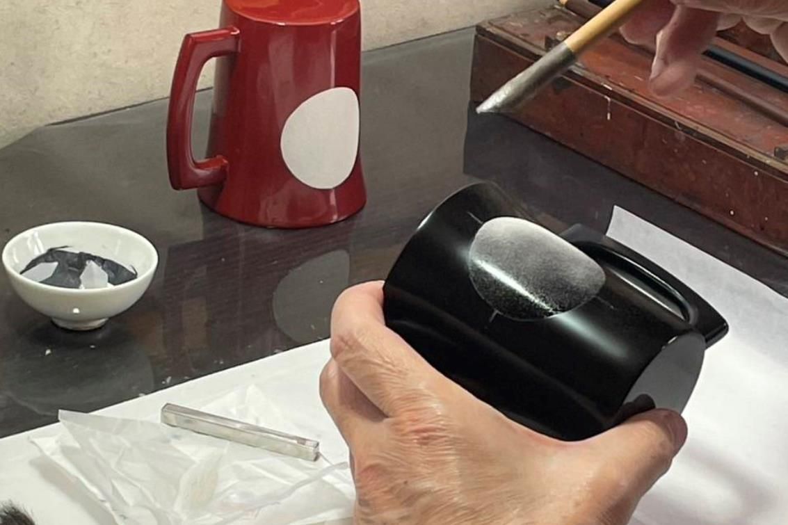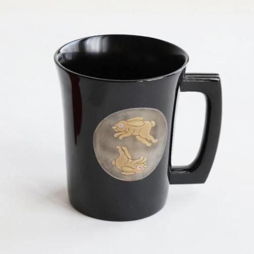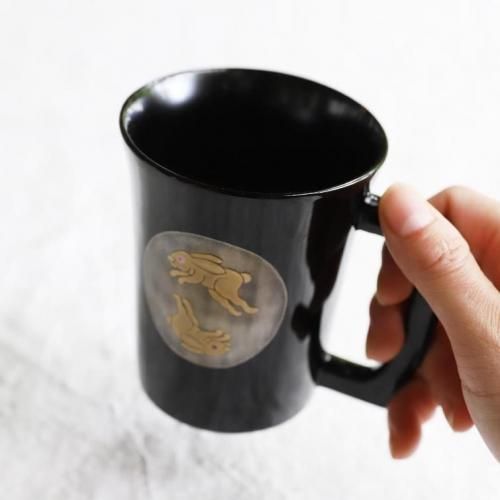 マグカップの加飾は蒔絵です。蒔絵は、漆器の表面に漆で絵や文様、文字などを描き、乾かないうちに金や銀などの金属粉を蒔いて定着させる技法です。その中でも高蒔絵という技法でうさぎが立体的に仕上げられています。これは大変時間のかかる技法です。表面が盛り上がるように何回も塗っては乾かし、塗っては乾かし厚みを出します。