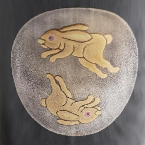 ご覧ください!小さなうさぎが楽しげに銀の月の中を跳びはねています。うさぎの目にも細かな細工がしてあります。赤い漆の目は螺鈿細工(※)に囲まれ光っています。もっと、よく見ると耳の内側と鼻には粒子の違う金がつかわれていて色の濃淡をより立体的にみせています。伝統工芸展に出品される著名な作家である蒔絵師の鈴谷昇洋志さんが、とても楽しんで蒔絵を施された様子が伝わってきます。